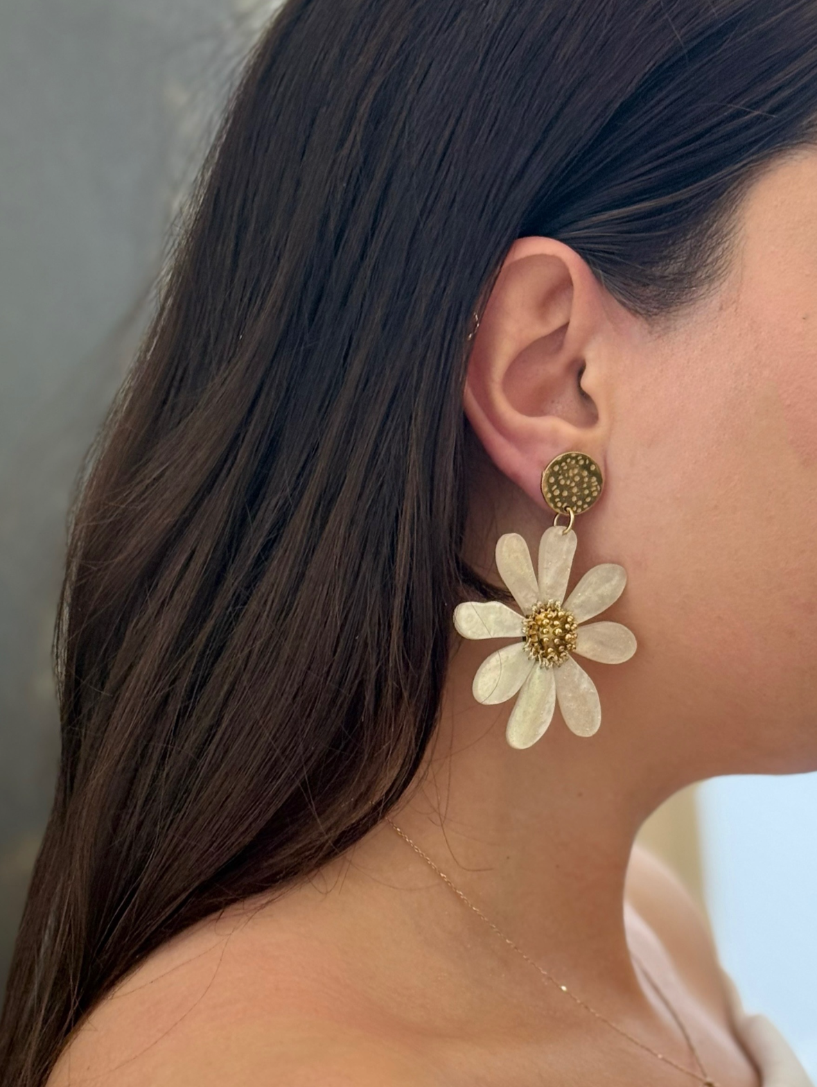 Les boucles d’oreilles Beybûn s’inspirent de la grâce simple des fleurs sauvages. Chaque pièce évoque une marguerite éclatante, avec ses pétales blancs nacrés subtilement pailletés et son cœur doré finement ciselé.