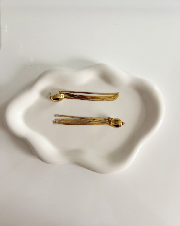 Les boucles d'oreilles Zêrîn capturent l’essence d’un mouvement fluide et lumineux. Leur sphère dorée, lisse et éclatante, donne naissance à une cascade de fines chaînes, évoquant la légèreté d’un voile doré caressant la peau.